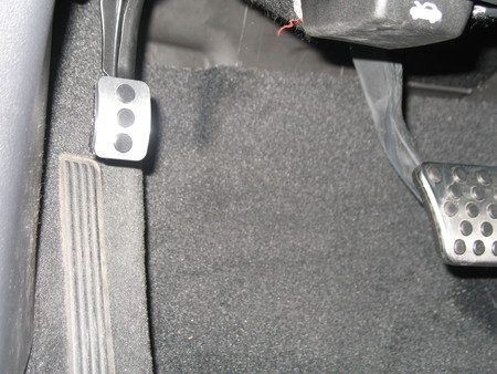 Well, I finally got my parking brake pedal from Ultimate Pedals. It took 2 weeks after it was ordered. Since their web site doesn't list a brake cover for the Challenger, I specified a "shiny smooth" parking brake cover, with flat rubber grips, for a 2009 Dodge Charger. To install it, they recommended drilling two holes in the parking brake plate. I didn't like that idea because I didn't want to drill anything and would only have been able to use the middle rubber grip in the empty slot.